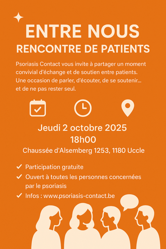 Entre nous : un moment pour se retrouver!Parce qu’il est parfois plus facile de parler à ceux qui comprennent vraiment, Psoriasis Contact vous invite à une soirée conviviale d’échanges et de soutien entre personnes concernées par le psoriasis.